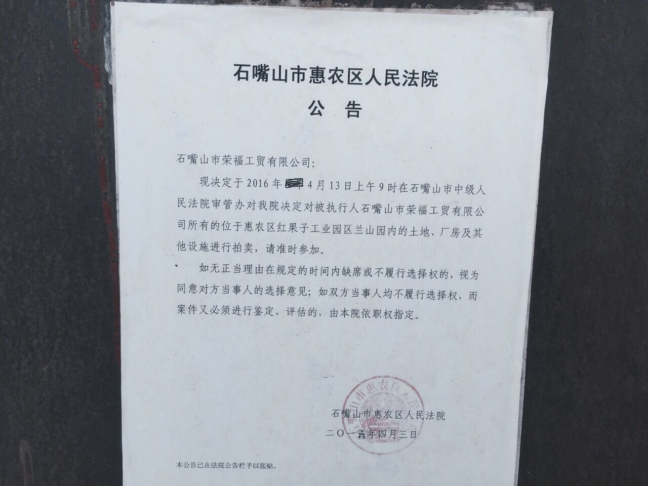 受石嘴山市惠農(nóng)區(qū)人民法院的委托,本公司定于2016年5月19日(星期四)15時(shí)舉行拍賣(mài)會(huì)對(duì)位于惠農(nóng)區(qū)紅果子鎮(zhèn)蘭山園內(nèi)的土地及地上建筑物、院內(nèi)設(shè)備進(jìn)行公開(kāi)拍賣(mài)。